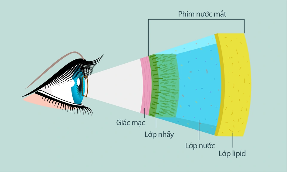 Trước khi hiểu về khô mắt, chúng ta tìm hiểu về nước mắt (phim nước mắt) được cấu tạo bởi 3 lớp: lớp mỡ, lớp nước và lớp nhầy. Lớp mỡ giúp hạn chế sự bốc hơi nước mắt. Lớp nước vai trò quan trọng cho nhãn cầu gồm cung cấp oxy cho biểu mô giác mạc, có tính sát trùng nhẹ, giúp rửa trôi bụi bẩn cho giác mạc trơn nhẵn. Lớp nhầy giúp dàn đều nước mắt trên giác mạc. Ba lớp này cùng “hợp lực” bảo vệ nhãn cầu khỏi những tác động xấu bên ngoài.