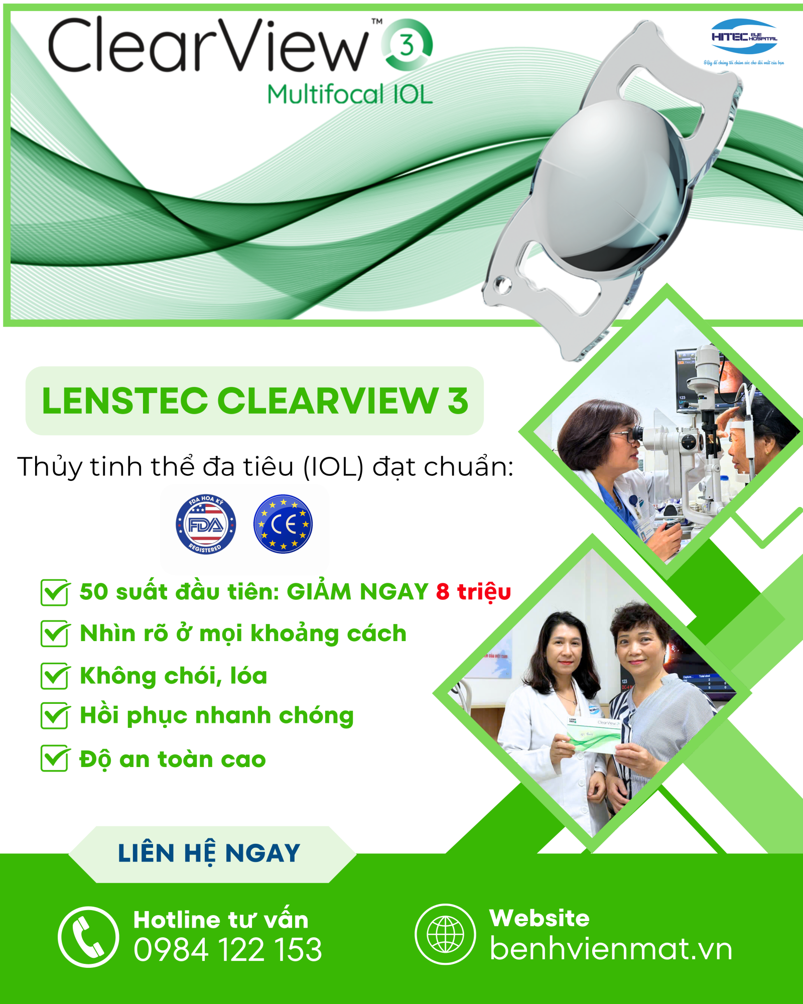 Lenstec ClearView 3 (Hoa Kỳ) là thế hệ thủy tinh thể đa tiêu (IOL) tiên tiến, được chứng nhận bởi FDA (Mỹ) và CE (Châu Âu). Công nghệ này giúp người bệnh nhìn rõ ở mọi khoảng cách – xa, gần, trung gian – với chất lượng hình ảnh tự nhiên, sắc nét và hạn chế tối đa hiện tượng chói, lóa sau phẫu thuật.A