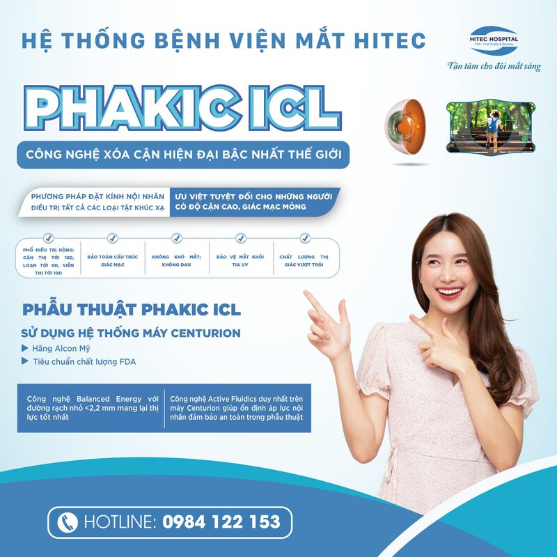 1. PHAKIC ICL LÀ GÌ? Phakic ICL là phương pháp phẫu thuật điều trị tật khúc xạ bằng cách đặt thấu kính nội nhãn sinh học (Implantable Collamer Lens –ICL) rất nhỏ, mỏng, cực kỳ mềm dẻo được thiết kế riêng theo thông số mắt của mỗi người. Phakic ICL có mặt trên thế giới hơn 30 năm, phổ biến tại 75 quốc gia với hơn 1.000.000 ca phẫu thuật đã được thực hiện. Có mặt tại Việt Nam đã hơn 10 năm, Phakic ICL ngày càng khẳng định hiệu quả vượt trội trong điều trị cận, viễn và loạn thị, ưu việt tuyệt đối cho những người có độ cận cao, giác mạc mỏng. Thấu kính ICL được đưa vào ngay sau mống mắt và phía trước thủy tinh thể có thể triệt tiêu đến 18 độ cận hoặc 10 độ viễn đi kèm 6 độ loạn. Khác với các phương pháp phẫu thuật khúc xạ bằng Laser cổ điển, phương pháp Phakic ICL không bào mòn lớp tế bào giác mạc. Vì vậy các giới hạn về độ dày giác mạc, độ khúc xạ cao của bệnh nhân không còn là cản trở trong điều trị bằng Phakic ICL. 2. ƯU ĐIỂM CỦA PHẪU THUẬT ICL: Thấu kính ICL giúp ngăn chặn tác động không tốt của tia UV lên thủy tinh thể và võng mạc, qua đó giảm thiểu nguy cơ đục thủy tinh thể sau này. Với đặc điểm mềm, mỏng, nhẹ và được cố định trong mắt, thấu kính ICL EVO không gây cộm vướng, đồng thời không bị xô lệch bởi các tác động bên ngoài như dụi mắt hay khi vận động mạnh. Nhờ đặc tính tương thích sinh học cao với cơ thể người, thấu kính ICL có thể tồn tại lâu dài trong mắt giúp duy trì thị lực ổn định. Khi về già, hoặc trong những trường hợp cần thiết, thấu kính có thể được lấy ra, để thực hiện một phẫu thuật khác như điều trị đục thủy tinh thể hoặc các bệnh lý võng mạc. Phakic ICL là phương pháp phẫu thuật rất phổ biến và được ưa chuộng tại các nước phát triển như Pháp, Đức, Mỹ, Thụy Sỹ, Nhật Bản, Hàn Quốc, Singapore, Trung Quốc. Theo dõi kết quả trên hàng nghìn mắt của bệnh nhân đã thực hiện phẫu thuật Phakic ICL tại Hệ Thống Bệnh Viện Mắt Hitec cho thấy phương pháp này đạt hiệu quả rất. Chất lượng hình ảnh sắc nét, thị lực ổn định và không gây khô mắt đem lại cảm giác tự do, thoải mái khi giải phóng đôi mắt khỏi cặp kính cận nặng nề là những trải nghiệm được các bệnh nhân đánh giá cao sau phẫu thuật. 3. NHỮNG LƯU Ý SAU KHI PHẪU THUẬT CẬN BẰNG PHƯƠNG PHÁP PHAKIC ICL: